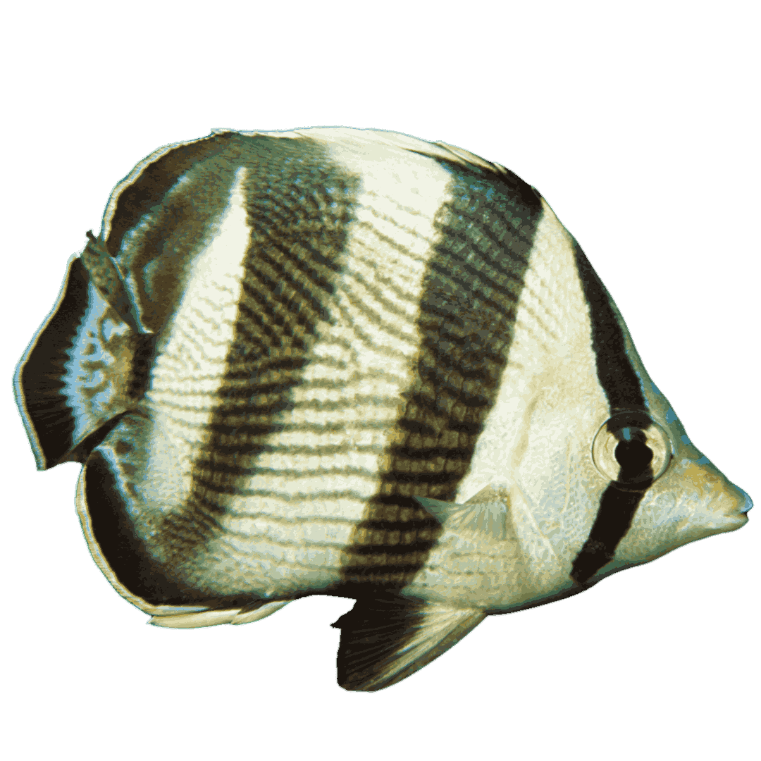 The Banded Butterfly gets its name for the small, black spot located on the end of the dorsal fin. But what is really neat about the Banded Butterfly is at night, this fish undergoes remarkable changes. The large, dark mark on the dorsal fin becomes black and broad, and dark bands appear on the body. It has also been known to swim upside down, and occasionally squirt water above the waterline. The Banded Butterfly is peaceful, most commonly found in shallow waters around coral reefs alone or in bonded pairs, who form a lifelong partnership. Most active during the day, they change color and seek shelter for sleep in the evening, as they are highly vulnerable to larger predators. The tank you put your butterfly in should be full of peaceful tank mates. Known for being hardheaded,the Banded Butterfly can be somewhat difficult to entice at first. To encourage eating, offer live, brine shrimp, clam, and squid or shrimp. Once eating regularly, you can begin feeding frozen brine shrimp.